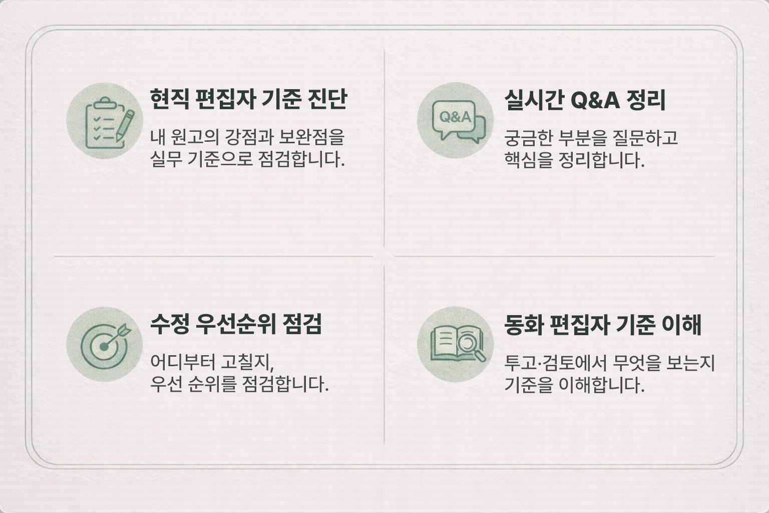 - 원고의 강점과 리스크를 편집자 관점에서 점검합니다.
